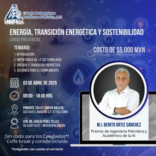 El Colegio de Ingenieros Petroleros de México (CIPM) invita a sus colegiados y a los interesados en la industria petrolera nacional al curso "Energía, Transición Energética y Sostenibilidad", impartido por el M.I. Benito Ortiz Sánchez.