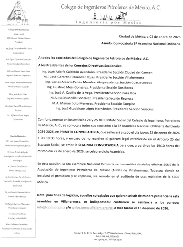 El Colegio de Ingenieros Petroleros de México, A.C. (CIPM) convoca a todos sus asociados y a los Presidentes de los Consejos Directivos Seccionales a participar en la 6ª Asamblea Nacional Ordinaria del bienio 2024–2026, que se llevará a cabo de manera híbrida (presencial y virtual).